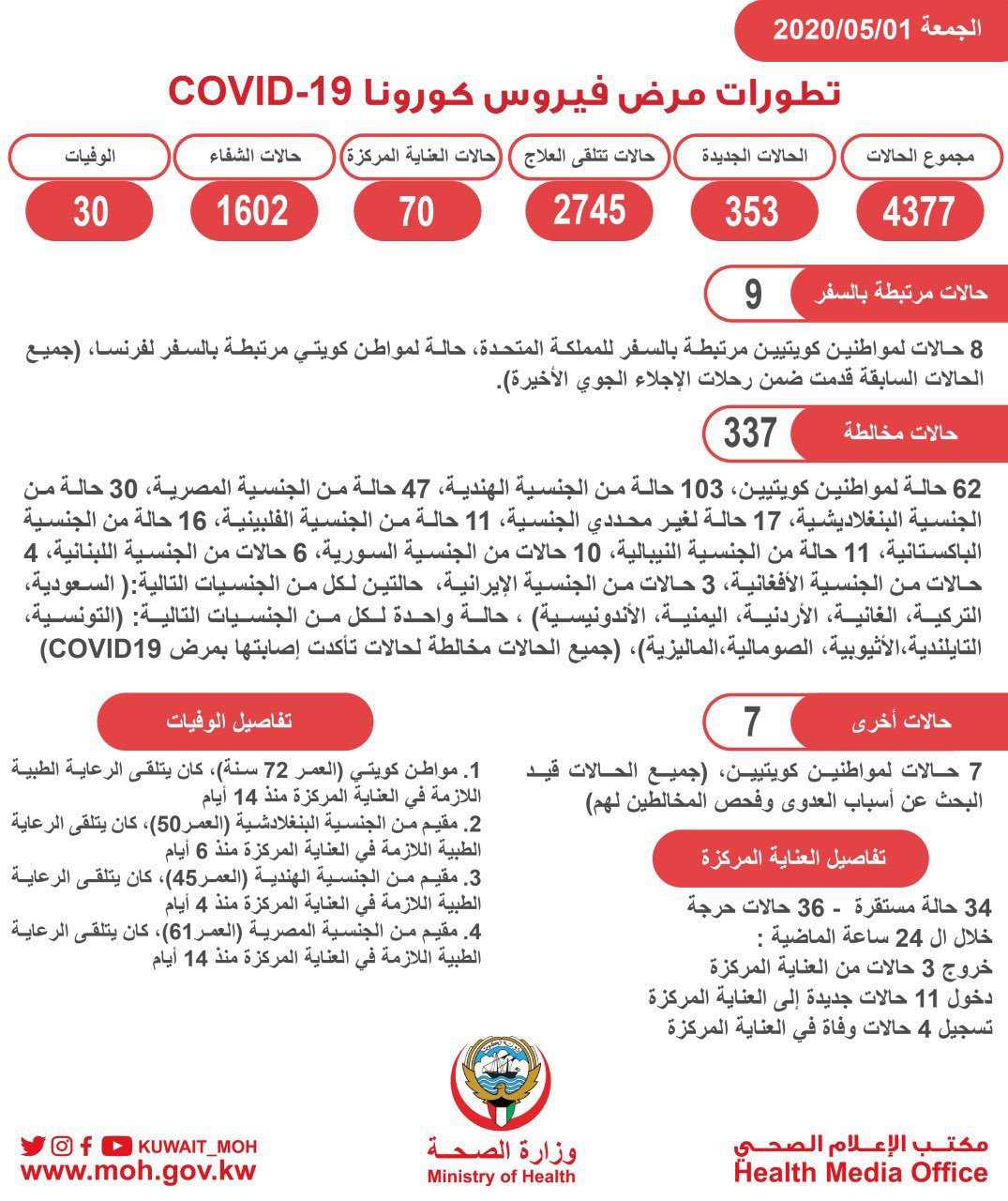 تم تسجيل اليوم أكبر عدد من الاصابات في الكويت باجمالي 353 حالة نسأل الله السلامة وندعو الله أن يزيل الغمة عاجلا غير آجل https://pbs.twimg.com/media/EW7YAUaX...jpg&name=large |