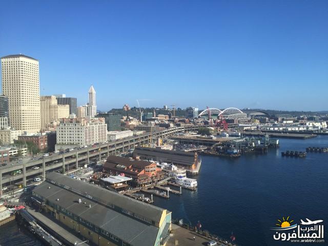 ومن بعيد صورة لمرفأ الرحلات البحرية في سياتل وفيها تشوفون طاحونة سياتل Seattle Ferris Wheel