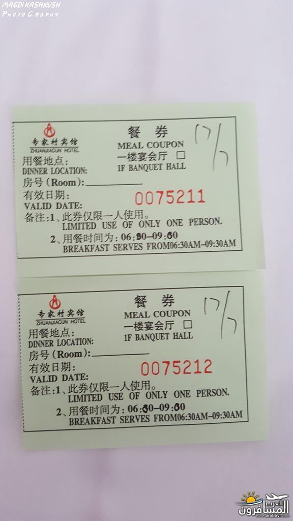 وصلنا بوابة الخروج الساعة الثالثة وعشرون دقيقة، ثم أكملنا مشينا حيث ينتظرنا السائق، وانطلقنا نحو فندق Zhuanjiacun Hotel في بلدة Wulingyuan المجاورة للغابة، والذي سنقضي فيه هذه الليلة وليلة غد. وصلنا الفندق خلال أقل من عشر دقائق، يبدو فندقا راق محترم، يعتبر من أفضل فنادق الخمس نجوم في المنطقة. وجدنا حقائبنا تنتظرنا في إحدى زوايا الصالة مغطاة بشبكة، ذهبت "ليندا" لإنهاء إجراءات الدخول، ثم أعطتنا مفاتيح الغرف وكوبونات وجبات الإفطار، أعطيناها 40 يوان إكرامية، مني ومن زوجتي 20 يوان، وذهبنا نبحث عن غرفنا في هذا الفندق الضخم. الغرفة رحبة مريحة، تحتوي على سريرين، كنب، طاولة وتلفاز، مكيف، خزانة ملابس، حمام ومراحيض نظيفة.