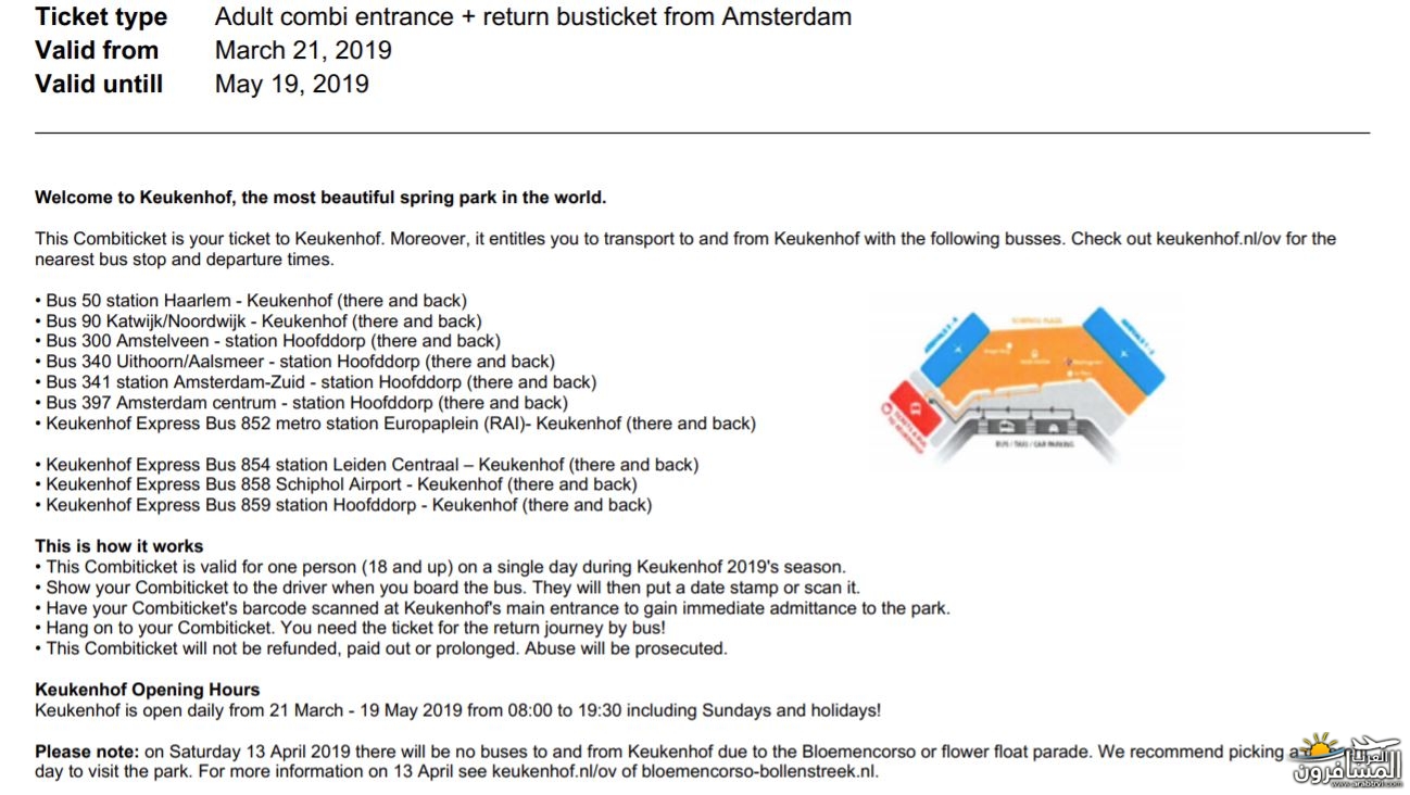والتذكرة لما بتتبعتلك على الإيميل بيكون فيها ارقام الباصات اللي ممكن تركبها من مناطق مختلفة للوصول للحديقة