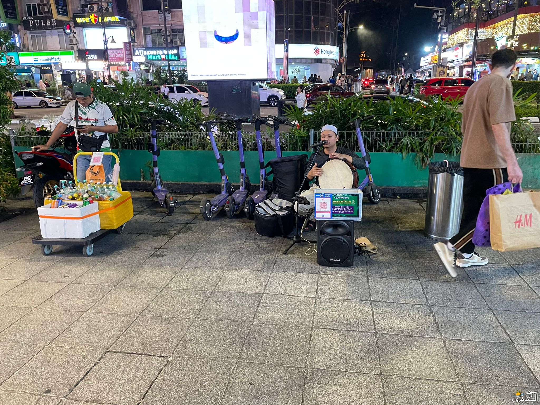 وقفنا في الشارع ننتظر سيارة الأجرة ، مع العلم بأن السير على الأقدام إلى الفندق لا يأخذ سوى 8 دقائق ولكن لكثرة المشتريات التي كانت معنا فقد طلبنا سيارة غراب ، وهنا شاهدت شاب ماليزي لطيف جالسا ينشد الأناشيد الجميلة بصوته العذب . وهنا أريد أن أستوقف قليلا ، سوف تشاهد كثيرا في العاصمة كوالالمبور وخاصة هذا الشارع المتسولين والمشردين وممن يضع كرسي وأمامع ميكريفون ومكبر صوت ويغني ويعزف وأمامه صندوق صغير لتضع له مما تحب من النقود ، حتى أنني وجدت في أحد المرات رجل جالس ويصدح بالغناء ولكن صوته نشاااااز ومزعج جدا كنت أريد أن أعطيه نقودا وأقول له أرجوك توقف عن الغناء مقابل هذا المال أعود لموضوعنا فهذا الشاب الماليزي بصوته الندي تقف مطروبا لصوته وللنشيد الذي يلقيه ، وهذا لم ألاحظ مثله من قبل . |