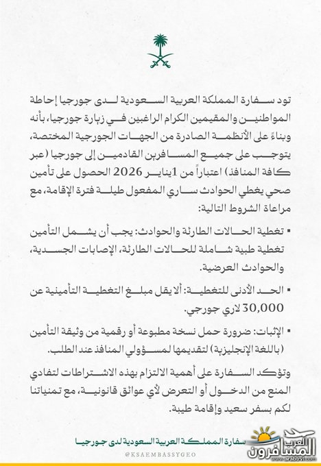 تود السفارة لدى جورجيا إحاطة المواطنين بأن السلطات الجورجية تشترط اعتبارًا من 1 يناير 2026 حصول جميع القادمين إلى جورجيا على تأمين صحي ساري المفعول يغطي الطوارئ والحوادث وبحد أدنى 30,000 لاري جورجي مع إبراز وثيقة التأمين عند الدخول. حفظًا لسلامتكم وتجنبًا لأي عوائق قانونية